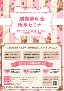 創業補助金活用セミナー 〜 これから創業する方へ 創業補助金について学びませんか 〜 日時: 令和4年4月27日 (水) 14:00〜16:00 場所: コラッセふくしま6階 福島駅西口インキュベートルーム マルチパーパスルーム(福島市三河南町1-20) 定員: 会場15名 (事前申込、先着順、福島県民限定) オンライン15名 この記事のタイトルとURLをコピーする 令和3年度 福島駅西口インキュベートルーム講演会 前の記事 第2回 福島駅西口インキュベートルーム勉強会 次の記事