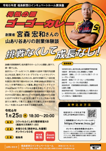 ゴーゴーカレー創業者宮森宏和さんの山あり谷ありの創業体験談 〜 挑戦なくして成長なし! 〜 【講師】 ゴーゴーカレーグループ創業者兼取締役会長 宮森宏和 氏 日時: 令和6年1月25日 (木) 18:30〜20:00 場所: コラッセふくしま 5階研修室AB(福島市三河南町1-20) 定員: 会場50名 (事前申込、先着順) オンライン50名 この記事のタイトルとURLをコピーする 福島駅西口インキュベートルーム×福島市クリエイティブビジネスサロン合同勉強会 前の記事 福島駅西口インキュベートルーム×福島市クリエイティブビジネスサロン合同講演会 次の記事
