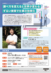 調べ方を変えると世界が変わる 〜 ずるい検索で仕事の効率化 〜 【講師】 一般社団法人ウェブ解析士協会ファウンダー 江尻俊章 氏 日時: 令和5年10月16日 (月) 18:00〜19:30 場所: コラッセふくしま6階 福島駅西口インキュベートルーム マルチパーパスルーム(福島市三河南町1-20) 定員: 会場20名 (事前申込、先着順) オンライン30名 この記事のタイトルとURLをコピーする 福島駅西口インキュベートルーム勉強会 前の記事 令和5年度 福島駅西口インキュベートルーム講演会 次の記事