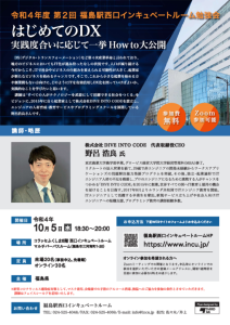 はじめてのDX 〜 実践度合いに応じて一挙How to 大公開 〜 【講師】 株式会社DIVE INTO CODE 代表取締役CEO 野呂浩良 氏 日時: 令和4年10月5日 (水) 18:30〜20:00 場所: コラッセふくしま6階 福島駅西口インキュベートルーム マルチパーパスルーム(福島市三河南町1-20) 定員: 会場20名 (事前申込、先着順) オンライン30名 この記事のタイトルとURLをコピーする 令和4年度 第1回 福島駅西口インキュベートルーム勉強会 前の記事 第3回 福島駅西口インキュベートルーム勉強会 次の記事